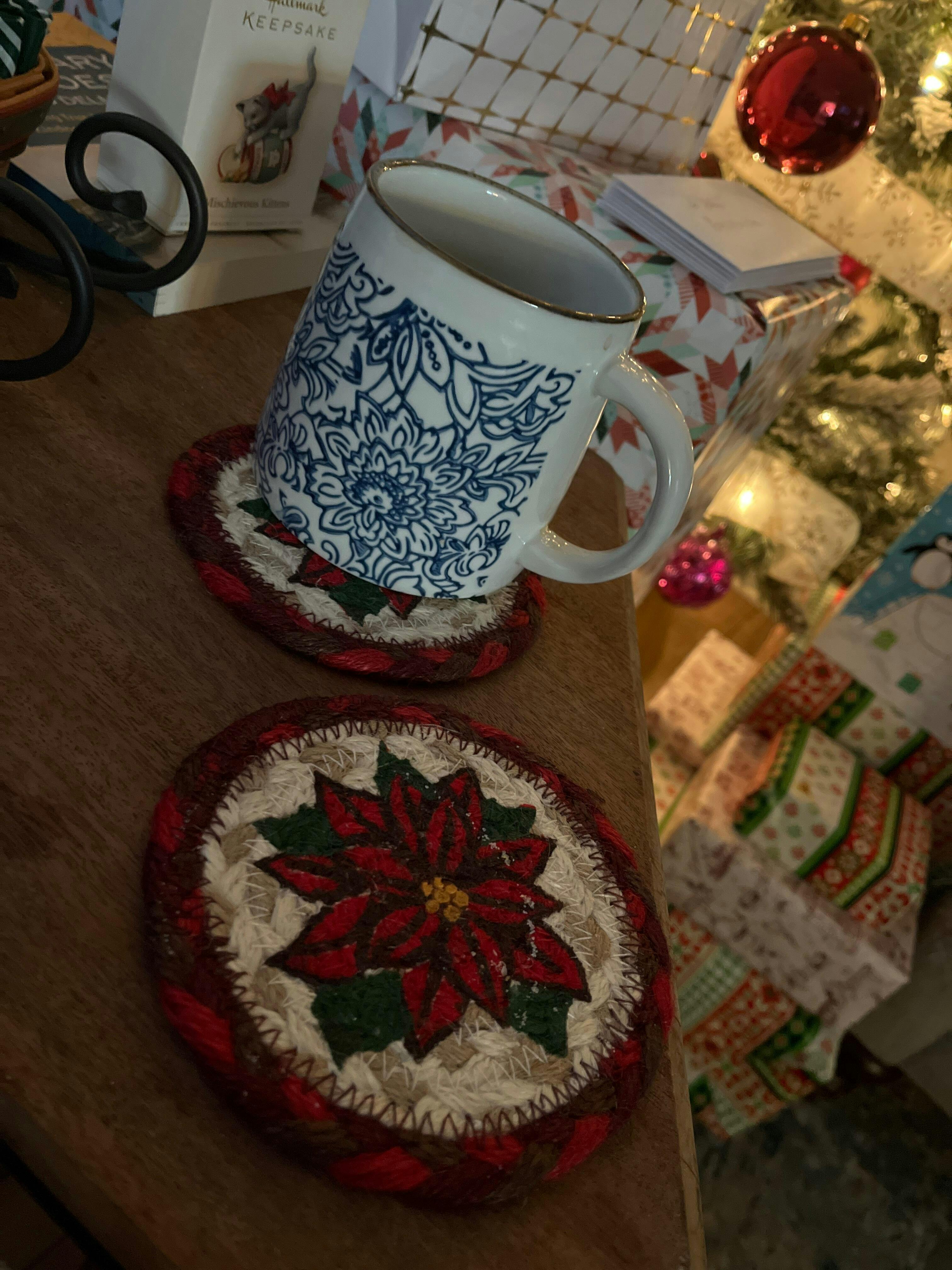 - Braided jute coaster with holiday artwork