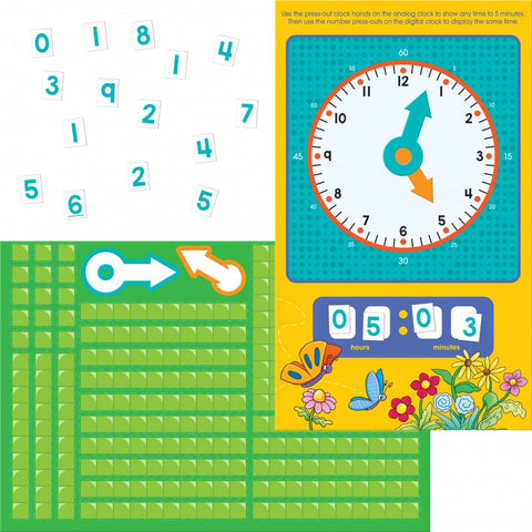 Make math fun with this colorful math activity book! The Math Basics Grade 2 Press-Out Workbook 02372 has press-out base ten pieces, the numbers 0-10, and analog clock hands, along with a clock face (on one side) and base ten activity board (on other side). Teaches skills like place value, time, geometry, and more.